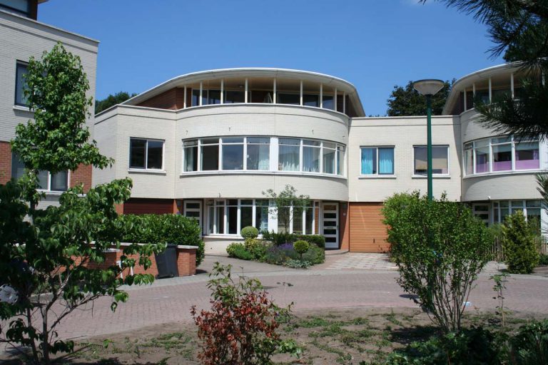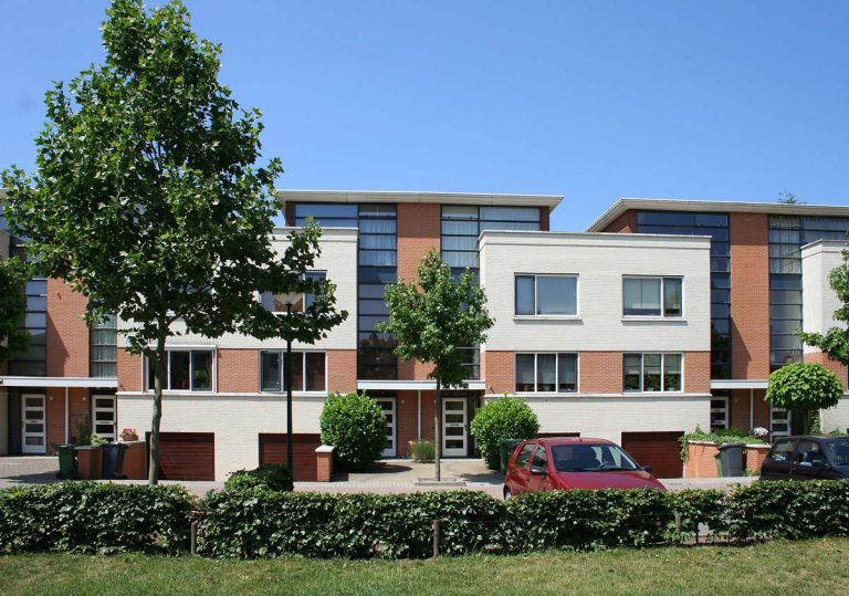 Onder een aantal woningen ligt een half verdiepte garage met daar achter een anderhalve verdieping hoge woonkamer. De trappenhuizen in deze split level woningen ontlenen hun ruimtelijkheid aan grote en dus bruikbare bordessen aan de gevel. Het project heeft door de toepassing van loggia’s, kleurgebruik en doorlopende geprofileerde dakranden van wit beton een klassiek-moderne uitstraling, waarmee recht gedaan wordt aan de monumentale en parkachtige omgeving.