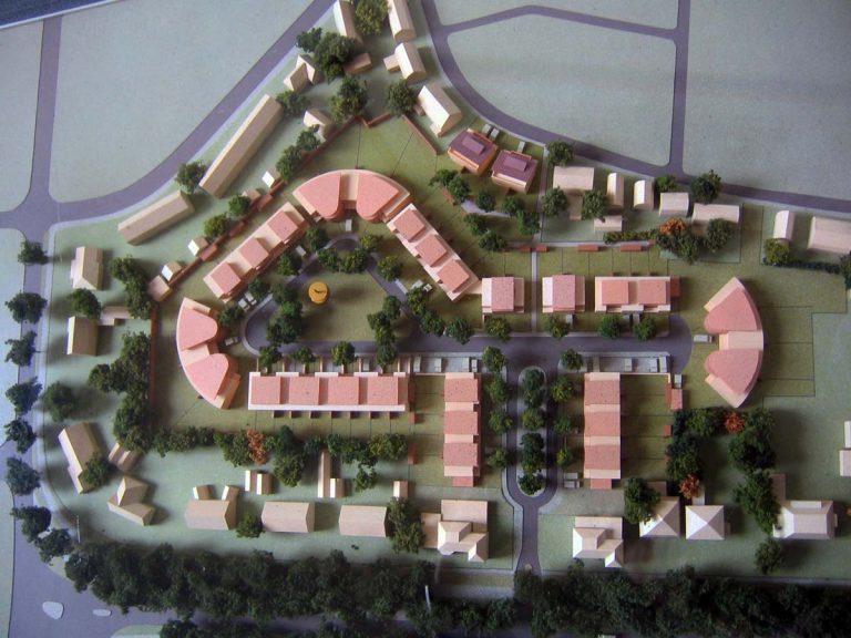 Op een voormalig fabrieksterrein, bijna geheel omsloten door achtertuinen, is een introvert wijkje gerealiseerd van 54 geschakelde woningen. Het binnen gebied kent verschillende ruimten, allen gelegen aan een asymmetrisch assenkruis. Het entreegebied wordt gevormd door een symmetrisch plein, waarop de twee assen haaks aansluiten. De lange as wordt aan beide uiteinden beëindigd door kwartronde bebouwing met grote erkers aan de voorzijde.