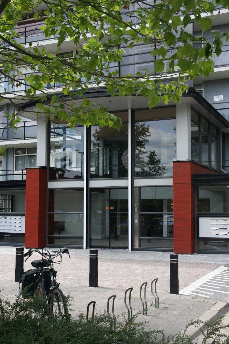 Door beide gebouwen boven de plint in één kleur te omkaderen over twaalf en tien verdiepingen is de eenheid ervan versterkt. Het kader wordt alleen door de hoofd entrees onderbroken. Deze zijn op de begane grond breed genoeg om ruim plaats te bieden aan alle postkasten. In het midden zijn de entrees hoger, om licht en ruimte te bieden aan aankomst en vertrek. In zulke entrees ga je gemakkelijk een gesprek aan en ontvang je vanzelfsprekend bezoek. De bewoners spreken zelfs van ‘onze balzalen’….