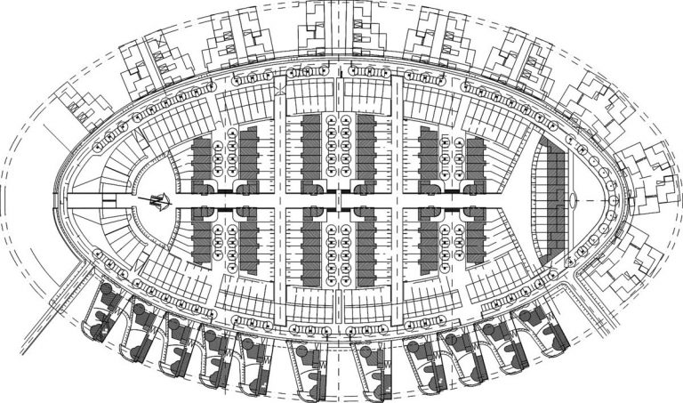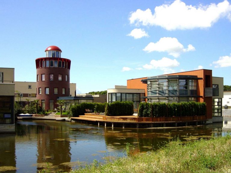 Langs de randen liggen waterpaviljoens en vuurtorens op een reeks schiereilandjes. De vuurtorens kennen een laag deel waarin de woonkamer is gesitueerd en een vier verdiepingen tellende toren. De bovenste verdieping heeft een ruimte met 360° uitzicht en een extra verhoging met koepeldak. De vuurtorens vormen een markant deel van de wijk welk op grote afstand herkenbaar is.