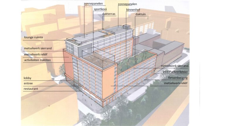 Het volume kent drie niveaus rond een binnenhof en sluit daarmee aan op de omgeving en het naastliggende kantoorgebouw. In twee van deze volumes worden de appartementen ontsloten middels een corridor. Het derde volume heeft een galerijontsluiting waaraan wat grotere appartementen gelegen zijn. De daken zullen ingevuld worden als verblijfsruimte met sportvoorziening, een terras en een groentetuin. Het hoogste dak wordt voorzien van zonnepanelen.