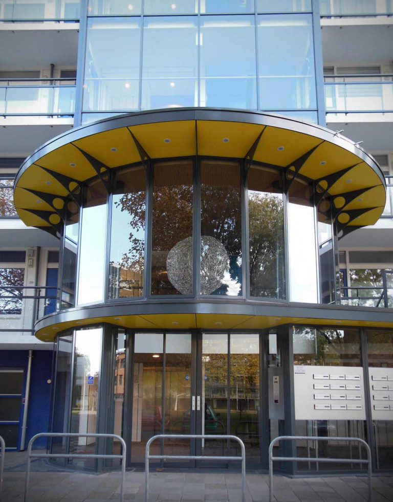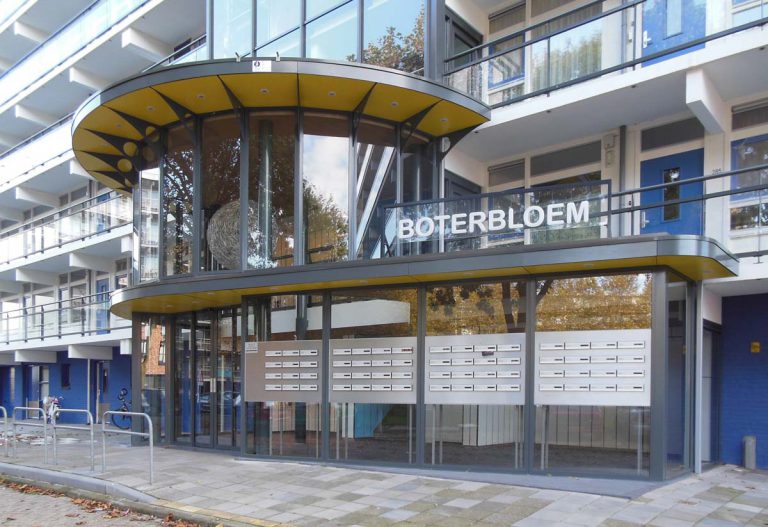 Bij de entree van gebouw ‘Boterbloem’ is gekozen voor een metafoor terwijl de vormgeving van de entree van ‘Zilvermos’ een logisch gevolg is van de wens een hoog entree deel te combineren met een lager postkastendeel.