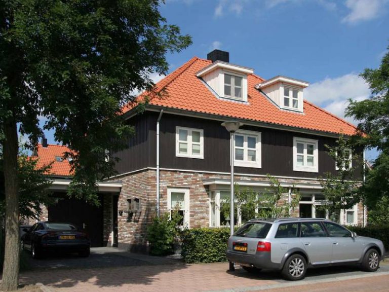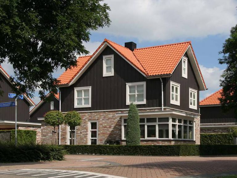 We hebben gekozen voor een landelijke benadering van kleurgebruik en materialisering. Door het toepassen van lichtgekleurd metselwerk met donkere accenten op de begane grond, een donkere gevelbekleding en oranje pannen ontstaat een grote eenheid in de buurt. Grote overstekken, zinken goten en brede kozijnlijsten versterken het klassieke beeld.